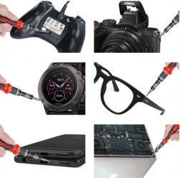 Det brede udvalg af bits og tilbehør dækker service af smartphones, tablets, laptops, kameraer, gamecontrollere samt arbejde inden for urværk og optik. Det ergonomiske håndtag med skridsikkert gummi og den fleksible forlængelse gør arbejdet lettere selv på trange steder.