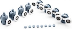 Nylon i kombination med rustfrit og kulstofstål modstår korrosion og belastning. Hjulene tilpasser sig føringslistens form og holder stabilt.