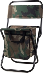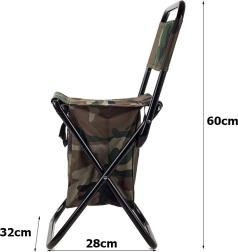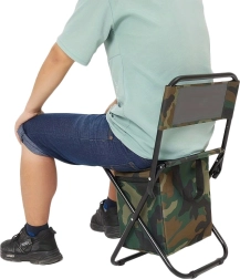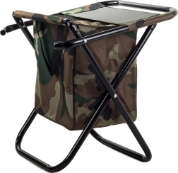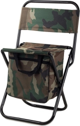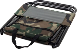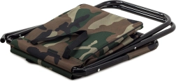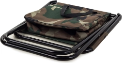 Let og kompakt turiststol i camo-stilen MORO med praktisk ryglæn og integreret taske under sædet. Tilbyder behagelig siddekomfort til fiskeri, camping og festivaler, en stabil stålramme og nem transport takket være håndtag og remme.