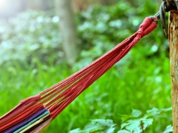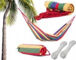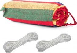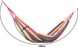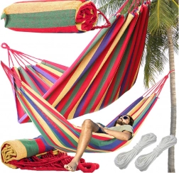 Denne stribede hængekøje bringer øjeblikkelig ro og komfort til din have eller altan. Det holdbare, åndbare tekstil og stærke flettede reb giver sikker og behagelig gyngning for én eller to personer. Når den rulles sammen, fylder den minimalt, og takket være de medfølgende snore kan du let hænge den op mellem træer eller på et stativ.