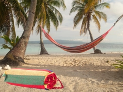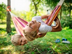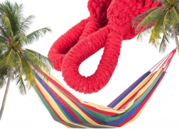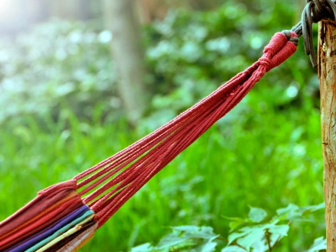 Pakken indeholder 2 fastgørelsessnore til hurtig ophængning mellem træer eller på et stativ. Når den rulles sammen, passer køjen i en taske, så du nemt kan tage den med på tur eller i camping.