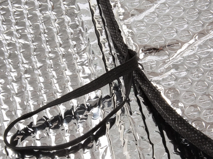 Den metaliserede overflade med bobleisolering reflekterer solens stråler, sænker temperaturen i kabinen og beskytter instrumentbræt og polstring mod at falme.