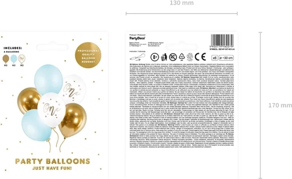 Stilfuldt sæt fødselsdagsballoner med teksten One i en kombination af pastel lyseblå, ren hvid og skinnende guld. Ideelt til den første fødselsdag, diameter 30 cm, pakke 6 stk.
