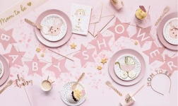 Giv din babyshower et charmerende udtryk med et papirbanner med stjerner og teksten Baby Shower. Den lyserosa udgave er ideel til blide, elegante og fotogene dekorationer.