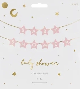 Stilfuldt banner med teksten Baby Shower i en blid lyserosa farve, som smukt fuldender pynten til fejringen af den lille ny. Dekorationen med stjerner skaber en yndefuld stemning, og med en længde på ca. 3 m passer den perfekt over en dessertbar, fotohjørne eller ved indgangen.