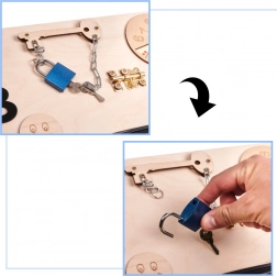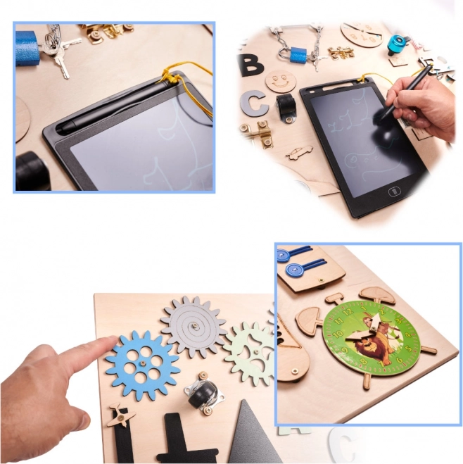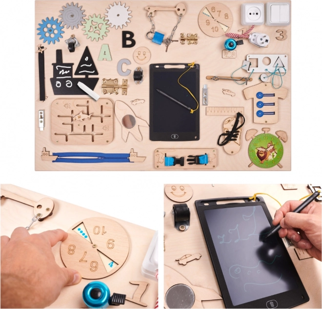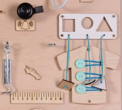Tavlen indeholder forskellige interaktive elementer såsom kontakter, lynlåse og andre småting, som børn kan håndtere sikkert for læring og sjov.