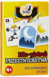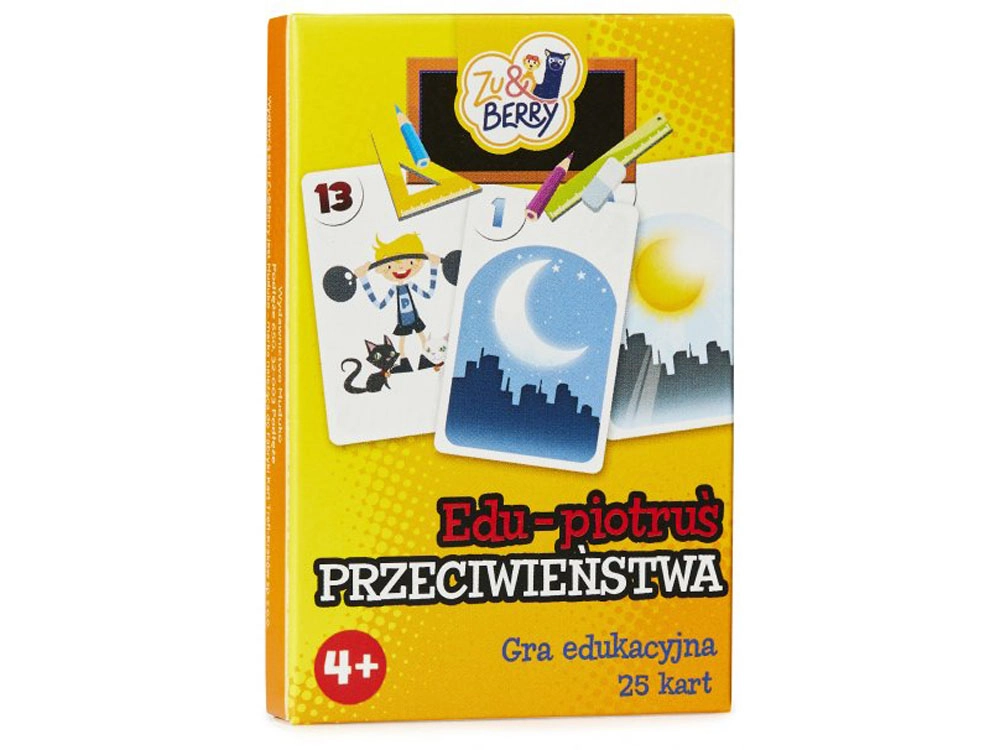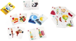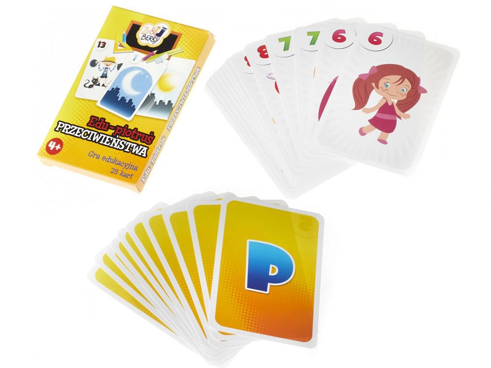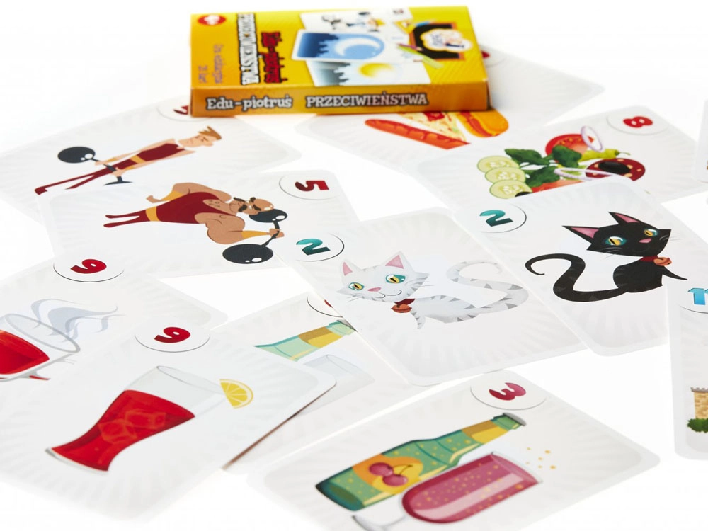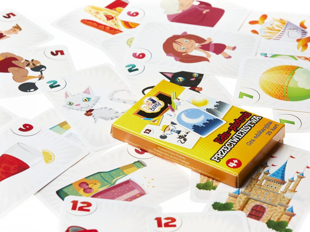 Sættet indeholder 25 kort med farverige illustrationer: 12 par, der viser billeder med modsatte betydninger, samt 1 kort med “sorteper”.