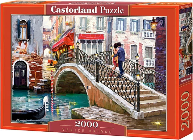 Puslespillet viser en kunstnerisk illustration af en romantisk bro i Venedig med et par på broen. Dette motiv giver billedet charme og mystik.