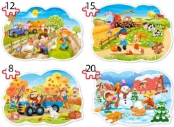 Sættet indeholder fire separate puslespil med 8, 12, 15 og 20 brikker – ideelt til at følge barnets udvikling og glæden ved hver succes.