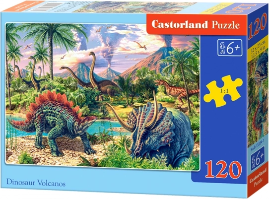 Farverigt børnepuslespil med dinosaurer og vulkaner, indeholder 120 brikker og danner efter samling et billede på 32 × 23 cm. Høj kvalitet, iøjnefaldende farver og ideel sværhedsgrad for børn fra ca. 6 år styrker koncentration, tålmodighed og fantasi.