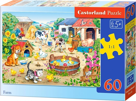 Farverigt børnepuslespil med gårdtema indeholder 60 brikker og danner efter samling et billede på 32 × 23 cm. Høj kvalitet og behagelige farver understøtter koncentration, tålmodighed og udvikling af fantasi hos børn fra cirka 5 år.
