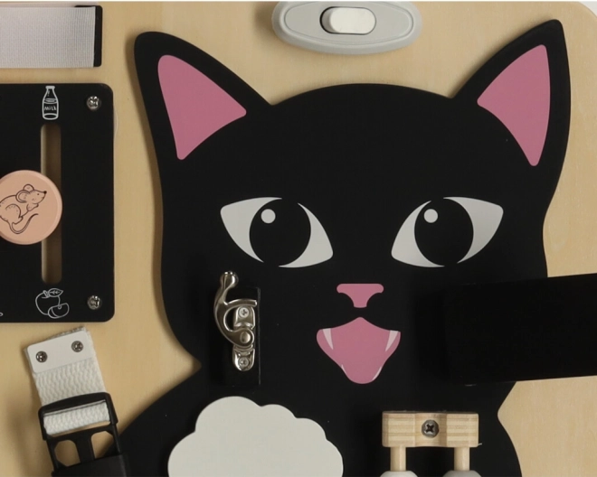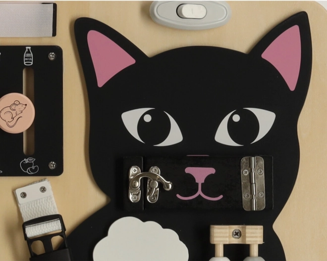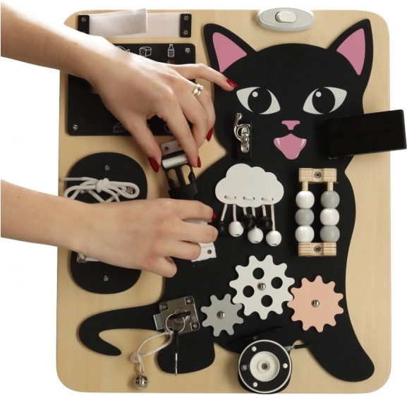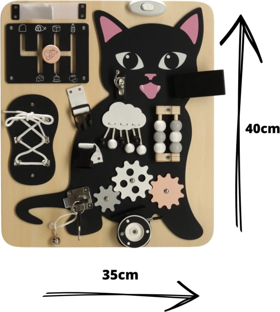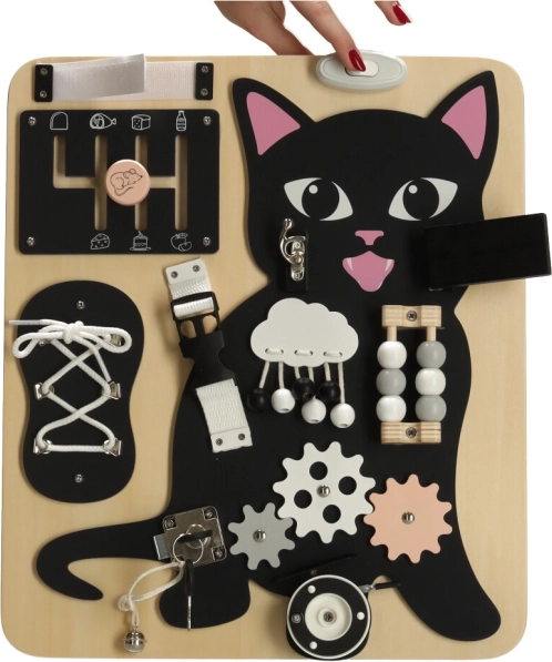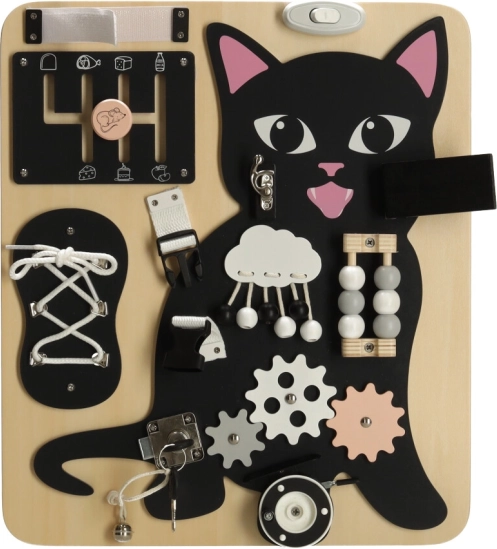 Kombinationen af en sort lille kat med lyse trædetaljer fanger opmærksomheden og holder barnet underholdt i mange timer.