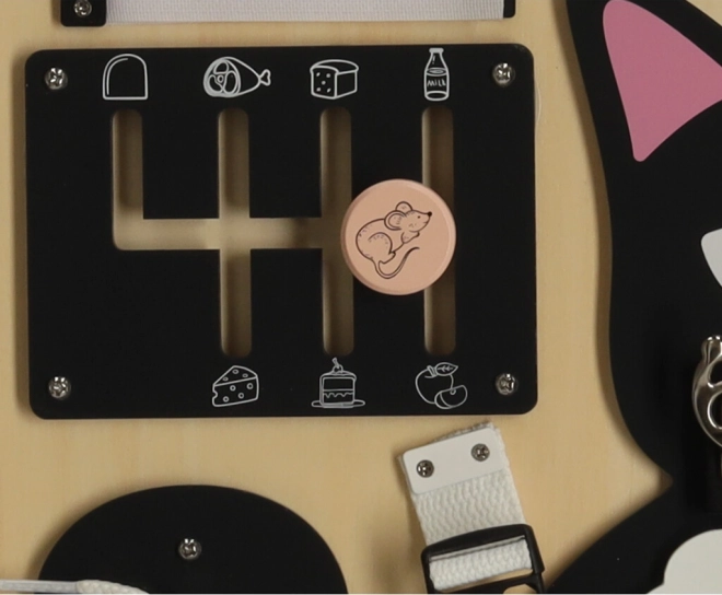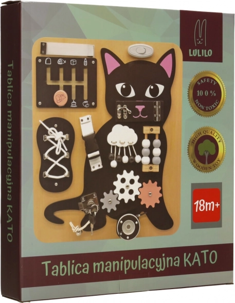 Tavlen Lulilo formet som en kat er en populær lærerig legetøj for børn, der opfordrer til at rotere, trække, binde og skubbe. Den hjælper dem med at udvikle finmotorik, præcision i bevægelser og styrke i hænderne. Sjove gåder og opgaver stimulerer små børns kognitive færdigheder og bringer dem tilfredshed ved succes.