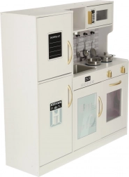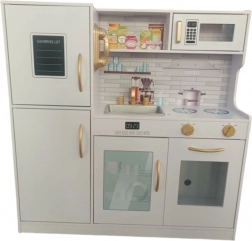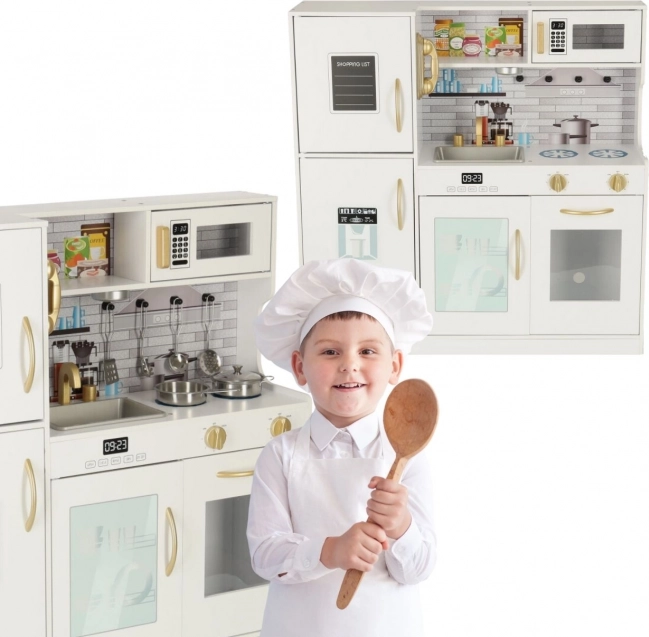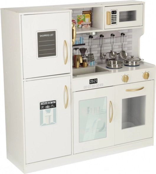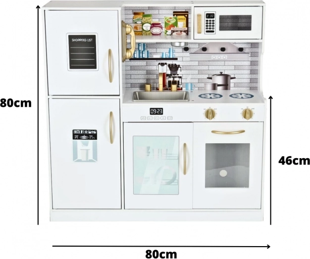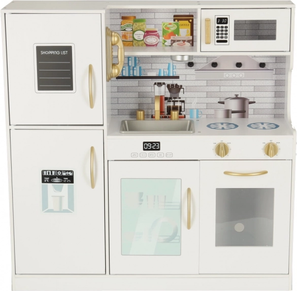 Køkkenet omfatter køleskab med fryser, opvaskemaskine, mikrobølgeovn, komfur og ovn, hvilket gør det realistisk og interaktivt. På køleskabet er der endda en telefon til at ringe efter familiens opskrifter. Køkkenets design i hvid med gyldne elementer passer perfekt ind i ethvert børneværelse.