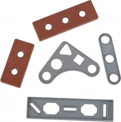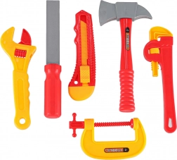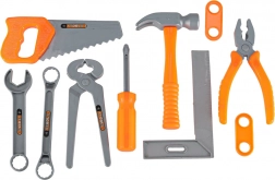Hammer, sav, tang, nøgler, skruetrækkere, konstruktionsdele samt skruer og møtrikker – alt til at skrue, save og samle på en sikker måde.