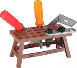 Stabilt plastbord med perforeret plade, skruetvinge og værktøjsholdere skaber et sjovt arbejdsmiljø for enhver lille gør‑det‑selv‑entusiast.