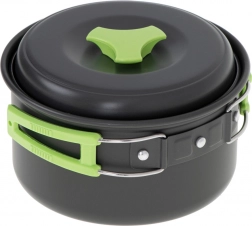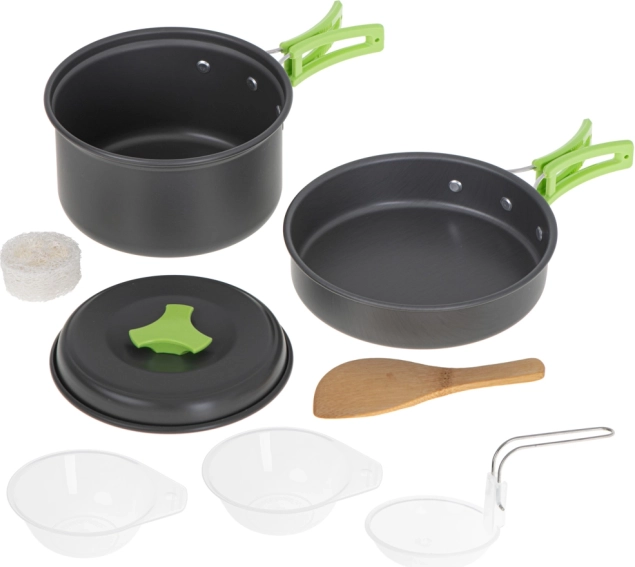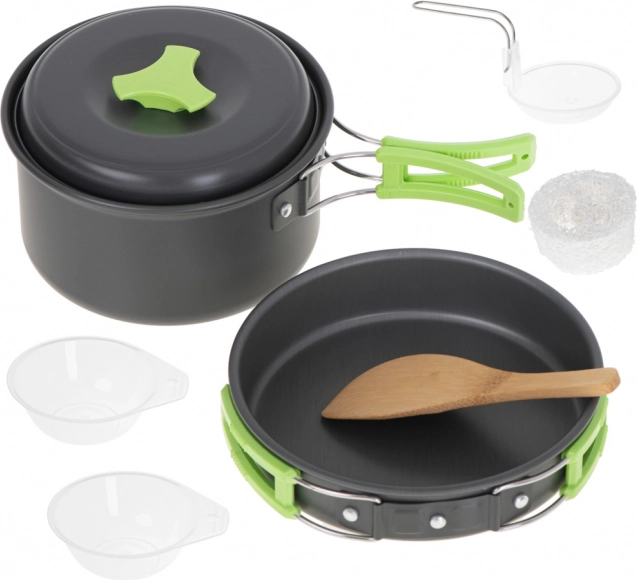 Forøg komforten ved din camping med turistsættet med køkkengrej. Takket være den lette og holdbare konstruktion af aluminium kan du nemt opvarme vand eller tilberede gode måltider i naturen. De foldbare håndtag gør det nemt at håndtere, og når du er færdig, kan du enkelt pakke grejet sammen i en praktisk emballage.