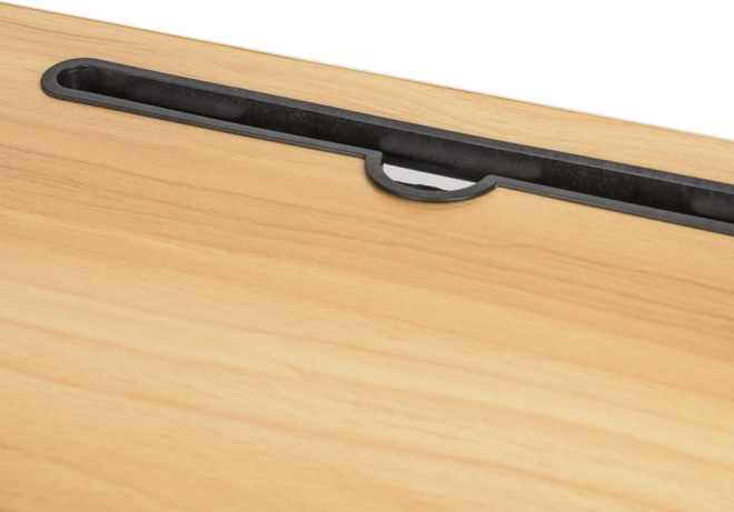 Bordet er udstyret med kabelhuller og en kopholder, hvilket øger dets brugervenlighed.