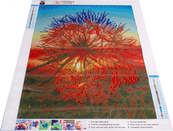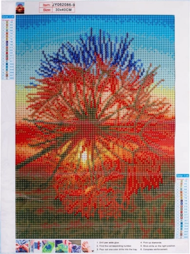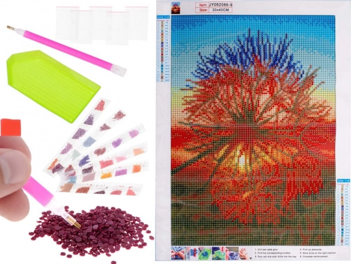 Oplev magien ved afslapning og skabelse med dette komplette sæt til 5D diamantmaling med motiv af en mælkebøtte ved solnedgang. Selvklæbende lærred med kodet gitter, farvede sten, applikator, voks og sorteringsbakke – alt hvad du behøver for et strålende billede, som du nemt skaber derhjemme og stolt kan udstille.