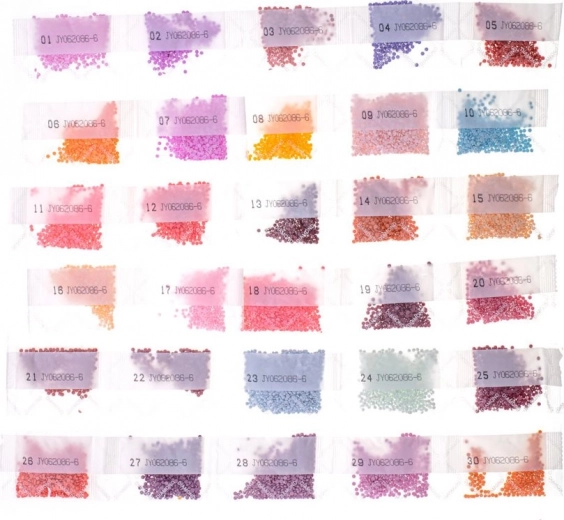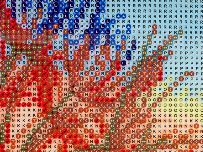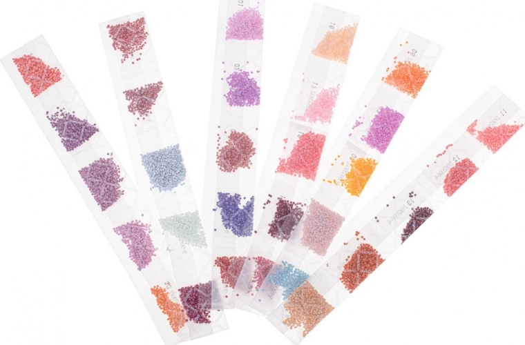 - Selvklæbende lærred med kodet gitter, farvede sten i poser, applikator (pen), voks, sorteringsbakke