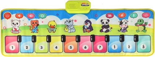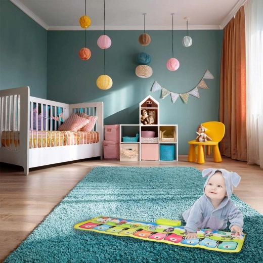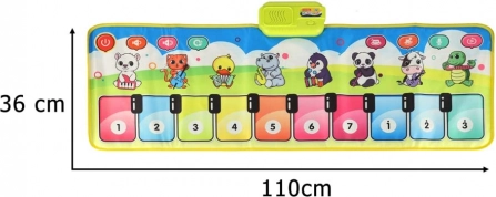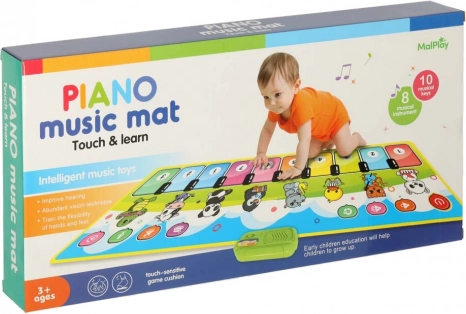 Denne bløde og bærbare musikmåtte for børn forvandler hvert skridt eller berøring til en glædelig tone. Børn kan udforske lydene fra otte instrumenter (klaver, cello, harmonika, saxofon, xylofon, klarinet, guitar, fløjte), spille på 10 nummererede tangenter og lytte til 10 indbyggede melodier. Ideel til at udvikle hørelse, rytme og motorik.