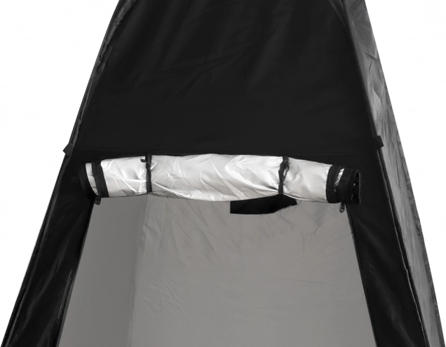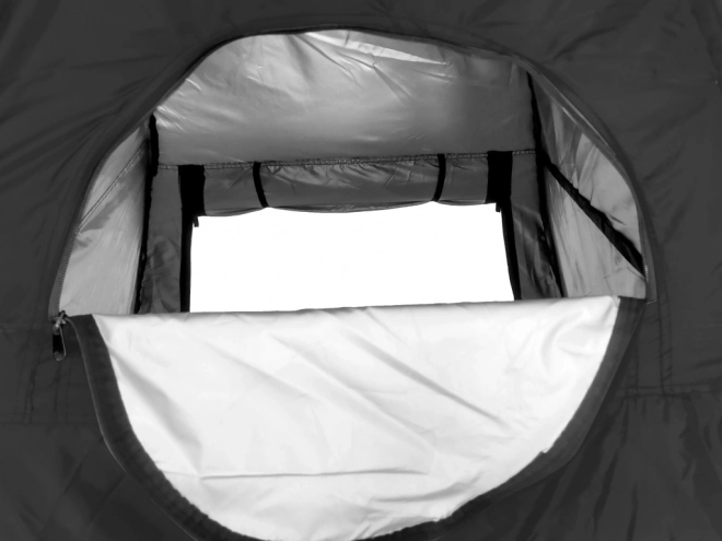 - Foran er der en indgang med lynlås. Bagtil er der en lille åbning også med lynlås, som fungerer perfekt som vindue. Teltet har ikke bund.
