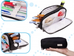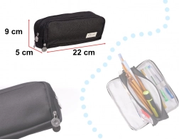 Alsidigt etui til skole, universitet og kontor. Tre separate rum med lynlås gør det nemt at organisere og hurtigt få adgang til blyanter, tuscher, lineal og andre småting. I sideafsnittene finder du små lommer og elastiske stropper, der hjælper med at holde tilbehøret sikkert på plads.