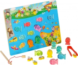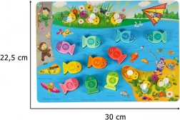 Dette kreative montessorisæt tilbyder børn tre lege i én: fiskeri med magnet og stang, indsættelse af fisk med tal i de rigtige huller og træning af finmotorikken med bier ved hjælp af pincet. Farverige elementer motiverer til leg, mens den kvalitetsrige træudførelse med afrundede kanter sikrer sikkerhed.