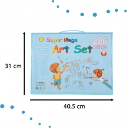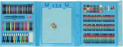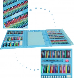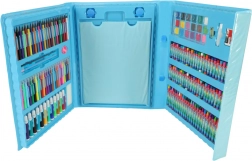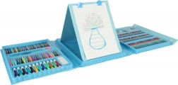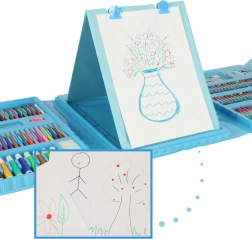 Opdag et komplet kunstsæt i en praktisk blå kuffert med indbygget staffeli – ideelt til børn og begyndende kunstnere. Indeholder et bredt udvalg af redskaber: tuscher, farveblyanter, voksfarver, oliepasteller, akvarelfarver og tilbehør. Alt er overskueligt organiseret i rum, let at transportere og klar til kreativt arbejde derhjemme, i skolen og på farten.