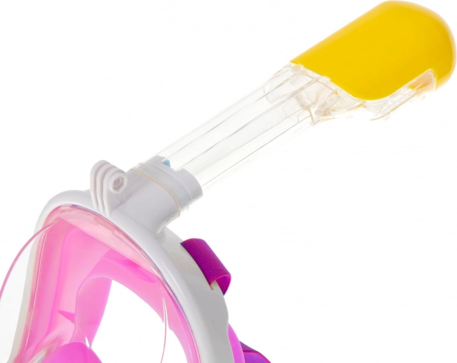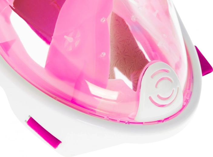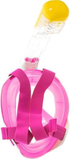 Fuld snorkelmaske S/M i lyserød med panoramisk udsigt, anti-dug system og dry-top snorkel. Komfortabel vejrtrækning gennem næse og mund.