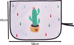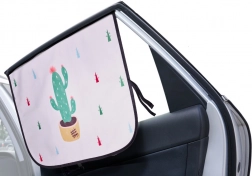 Praktisk og sikker beskyttelse til rejser med både børn og voksne. Det dobbelte lag polyesterstof med kaktusprint giver fuld mørklægning, dæmper blændende sol og forhindrer overophedning af bilen. På bagsiden står teksten “Go out and enjoy the sunshine” på sort baggrund.