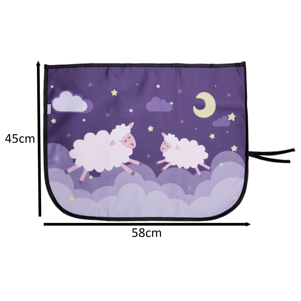 Berloligende natligt design med får, måne og stjerner skaber en rar stemning i bilen og fanger børns opmærksomhed.
