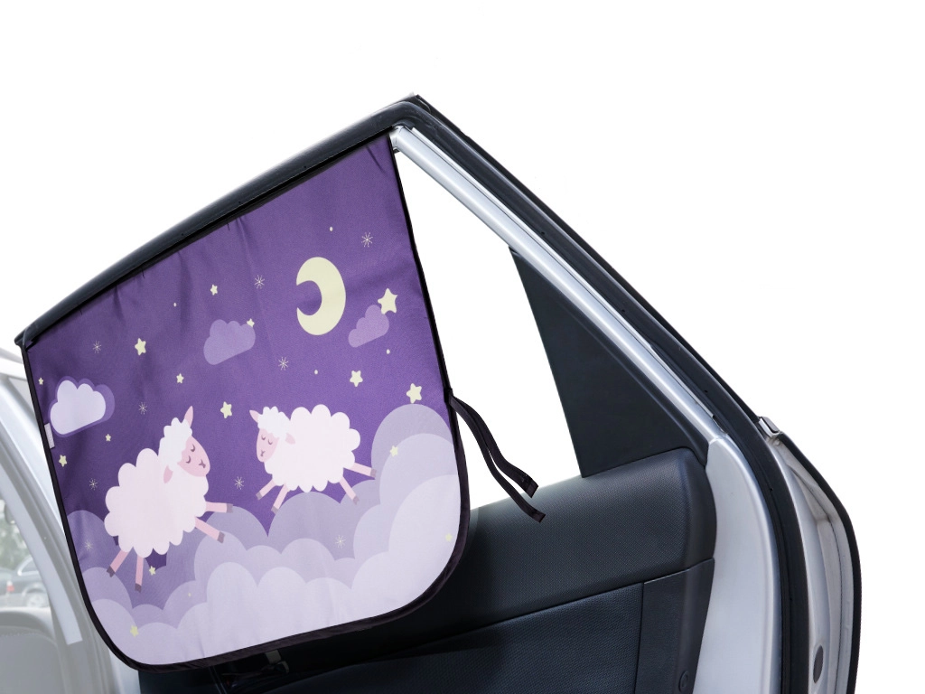 Praktisk magnetisk skærm til bilens siderude, der giver effektiv mørklægning, beskyttelse mod sollys og UV og sikrer en behagelig og sikker rejse for både børn og voksne. Dobbeltlags materiale med sødt fåre-motiv og nem montering med 5 magneter uden behov for lim.