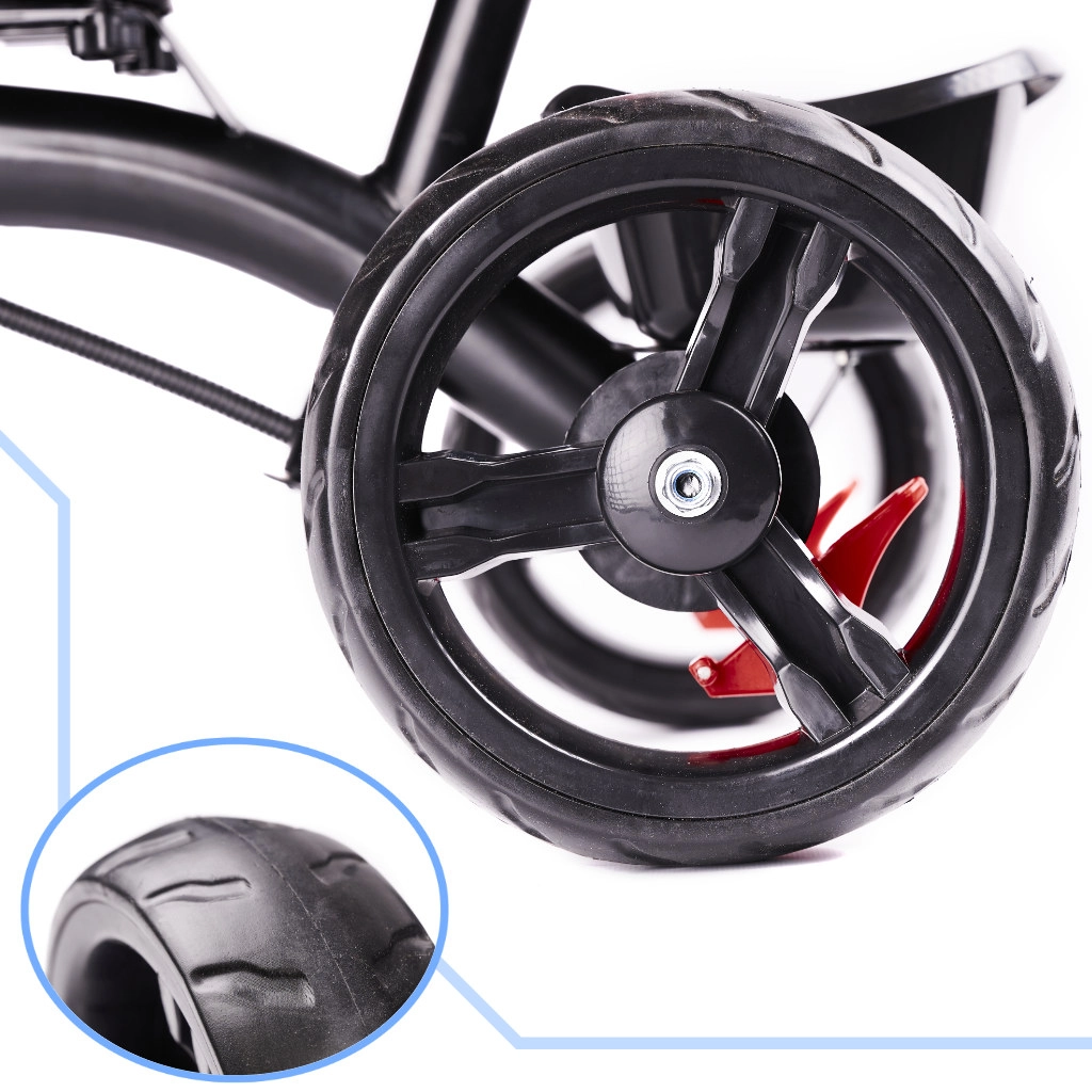 Sikkerheden sikres af sammenklappelige fodstøtter, sikkerhedsbøjle og sele. Forældre vil sætte pris på det 360° drejelige sæde for øjenkontakt eller udforskning i kørselsretningen og styrestangen med behageligt greb for præcis styring. Frihjul (friløb) gør det muligt at overtage kontrollen når som helst med en enkelt kontakt.