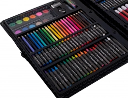Indeholder materialer til forskellige teknikker og stilarter – fra akvarel til tegning og grafik. Hver del er omhyggeligt placeret på sin plads, hvilket hjælper med at holde orden.