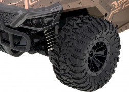 Bilen er udstyret med store gummidæk med mønster og et solidt chassis til at overvinde udfordrende terræn.