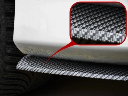 Den markante struktur af kulfiber giver bilen et moderne og sportsligt præg, der fremhæves på både kofanger og tærskler.