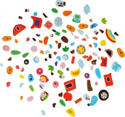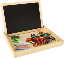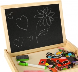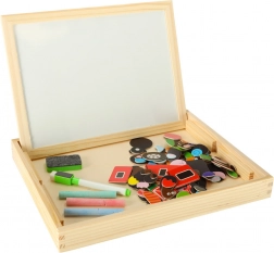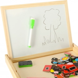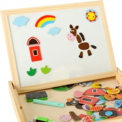 Den dobbeltsidede trætavle med magnetiske puslespil er ideel til kreativ leg for børn. Tavlen er lavet af kvalitetsnaturtræ og inkluderer forskellige elementer, der understøtter læring og leg.