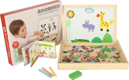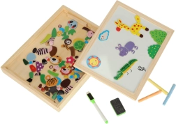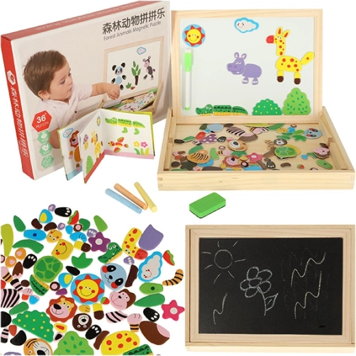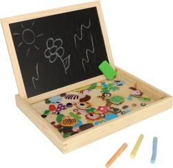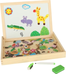Denne toværs tavle giver børn mange muligheder for at udvikle deres kreativitet. På den hvide magnetiske side kan de lægge farverige puslespil eller tegne med tusch, mens den sorte kridtside er beregnet til klassisk tegning med kridt.