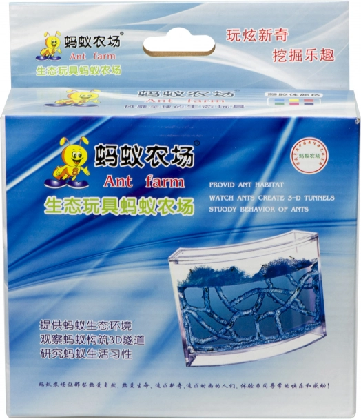 Dette pædagogiske myreakvarium er fyldt med en specialudviklet, ikke-giftig blå gel, som giver myrerne et egnet miljø til at grave tunneller og samtidig fungerer som føde. Det er nok at lave et par startåbninger i gelen, sætte et par myrer i, og så kan du med egne øjne følge deres arbejde og forandringen i koloniens indre struktur.