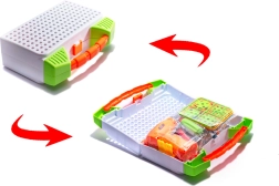 Den perforerede plade fungerer som base under legen og bliver til en kuffert, når I er færdige. Delene kan dermed nemt ryddes op og tages med overalt.