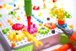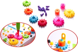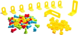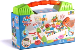 Sæt med skruer, forbindelsesstykker og formdele i klare farver gør det muligt at bygge mønstre, billeder og simple 3D-konstruktioner samt lære farver og former gennem leg.