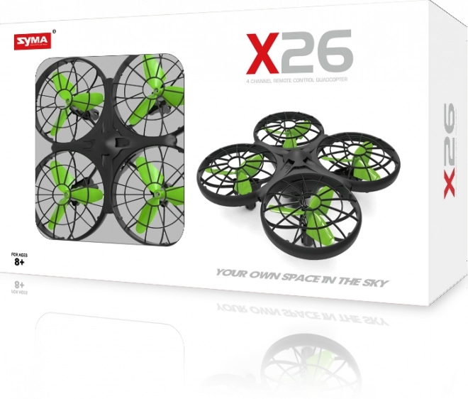 Syma sort RC Drone X26 er ideel til begyndere og avancerede piloter. Med kompakte dimensioner på 13 cm x 13 cm x 5 cm er den nem at transportere og kan tages med overalt. Dronen er designet til dynamiske flyvninger, med en maksimal hastighed fra 1 til 1,5 meter per sekund. Dette giver dig mulighed for at opdage nye perspektiver fra luften.