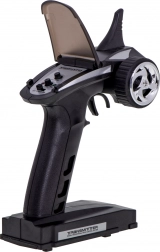 Pistolgrebs-sender på 2,4 GHz giver stabilt signal og rækkevidde på op til ca. 150 m. Nyd jævn gas, bakgear og følsom styring uden interferens.