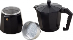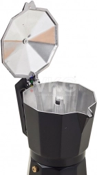 Den traditionelle mokkakande i et moderne sort design kombinerer tidløs æstetik med praktiske funktioner til den perfekte hjemmelavede espresso. Kroppen i aluminium er let, leder varme fremragende og sikrer hurtig tilberedning af din yndlingskaffe på omkring 5 minutter.