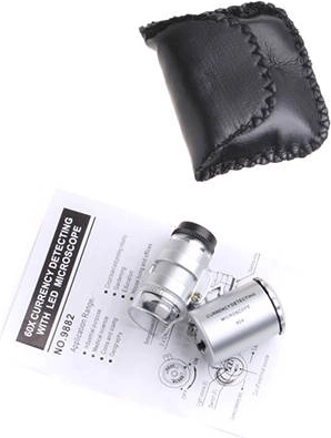 Lommemoskop med 60x forstørrelse, udstyret med 2 LED-dioder og UV-lys, gør det muligt at se selv den mindste detalje. En fremragende hjælper for guldsmede, teknikere og samlere.