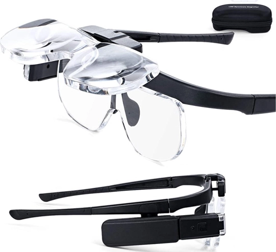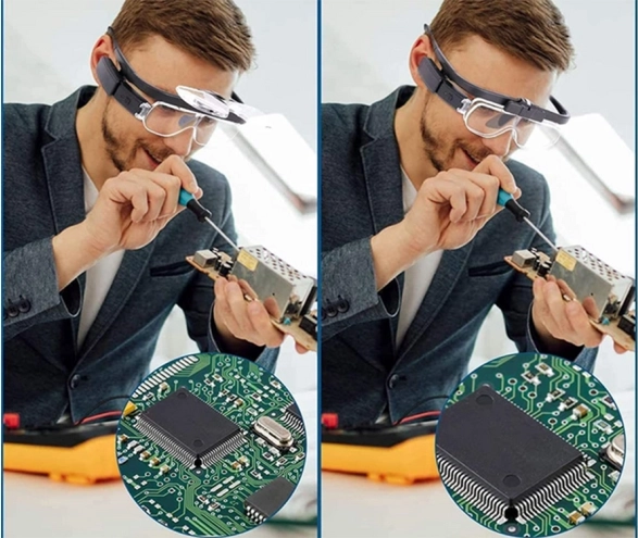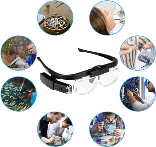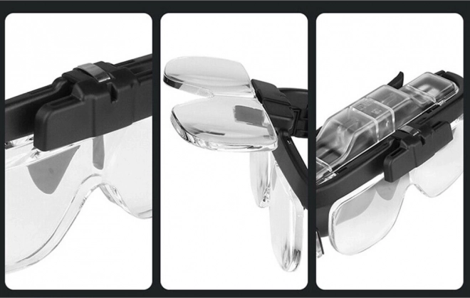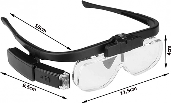 Pandeluppen i brille-stil frigør hænderne og sikrer et stabilt blik på detaljen. De tre udskiftelige linser 1,5x / 2x / 2,5x kan kombineres til højere forstørrelser 3,5x / 4,0x / 4,5x, så du nemt tilpasser effekten til den aktuelle opgave. Et par kraftige LED-dioder med justerbar lysretning belyser arbejdsområdet jævnt.