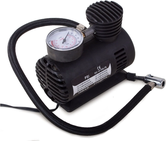 Pakken indeholder kompressor med slange, stik til cigarettænder, manometer og et sæt dyser til forskellige behov.