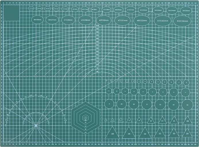 Det dobbeltsidede tryk tilbyder tydeligt læselige måleskalaer, rette linjer, vinkler og hjælpecirkler for hurtig og nøjagtig justering af materialet. Den skridsikre overflade holder materialet på plads, og en tykkelse på 3 mm beskytter bordet effektivt mod gennemskæring.