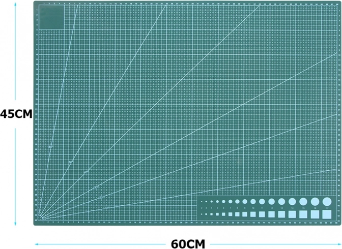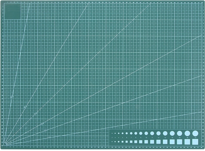 Praktisk selvhelende skæremåtte i A2-format beskytter arbejdsfladen og sikrer præcise snit. Takket være den flerlagede konstruktion lukker rillerne sig delvist, så overfladen forbliver glat. Dobbeltsidet tryk med centimeternet, vinkler og cirkler garanterer præcis måling og behageligt arbejde for både modelbyggere og syarbejde.